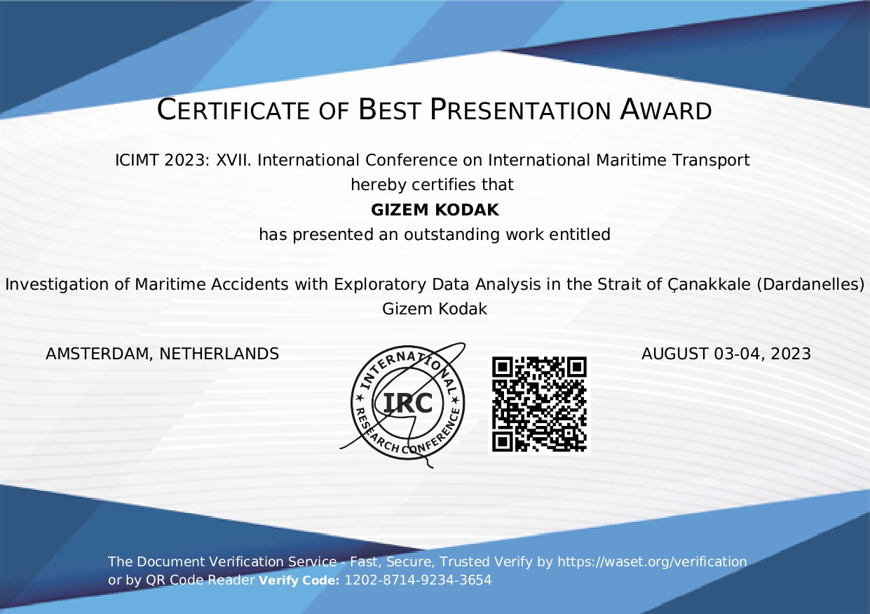 Girne Üniversitesi Deniz İşletmeciliği ve Yönetimi Fakültesi Dekan V. Yrd. Doç. Dr. Gizem KODAK, Amsterdam’da gerçekleştirilen XVII. International Conference on International Maritime Transport’ da En İyi Sunum Ödülünü kazandı.